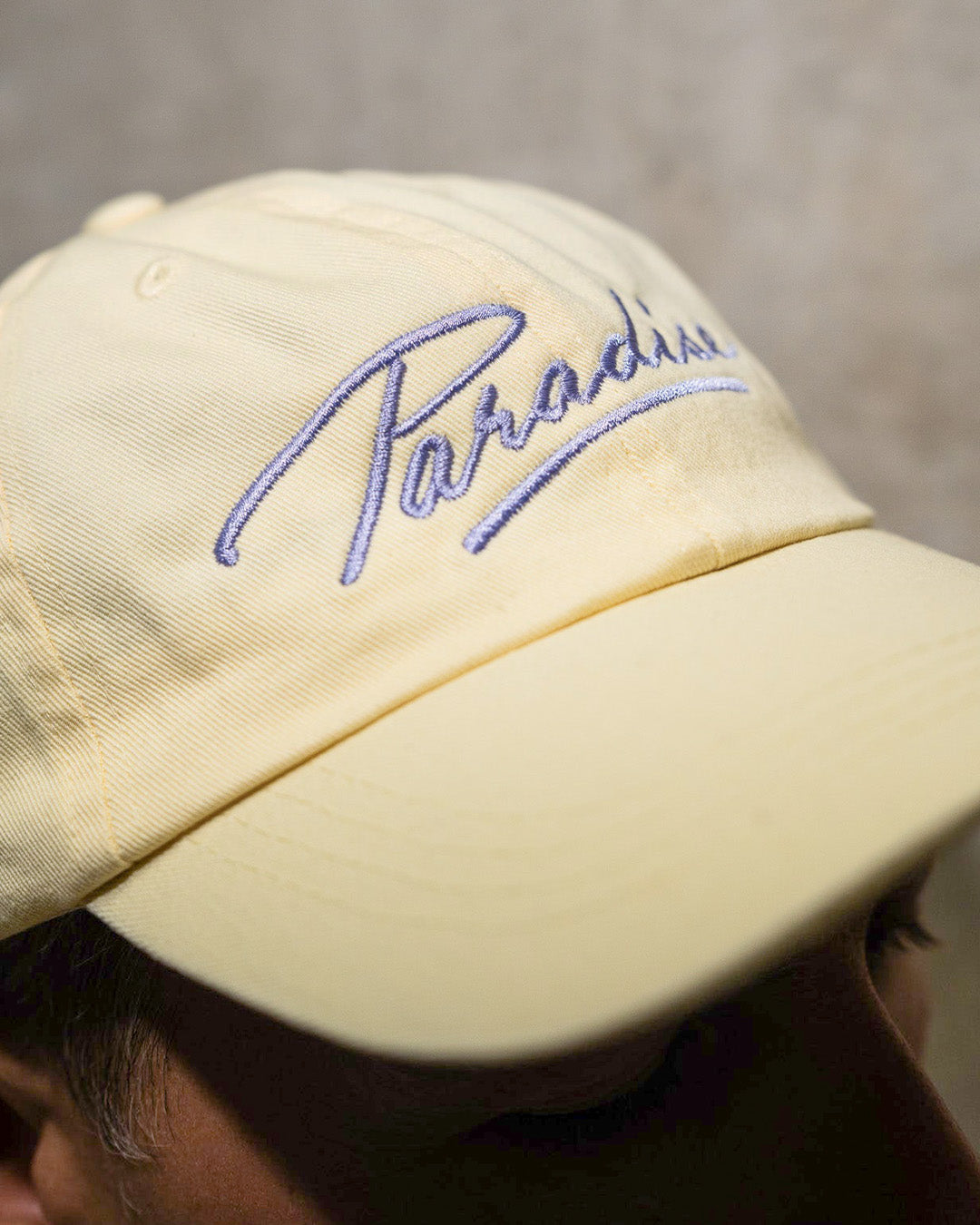Stay cool in the sun with this beach cap in a light lemon pastel yellow tone, featuring a light purple Paradise logo embroidered on the front and a Purple Disco Machine logo on the back/side. Made from 100% cotton and designed for a comfortable unisex fit, it’s the perfect accessory for your summer look.