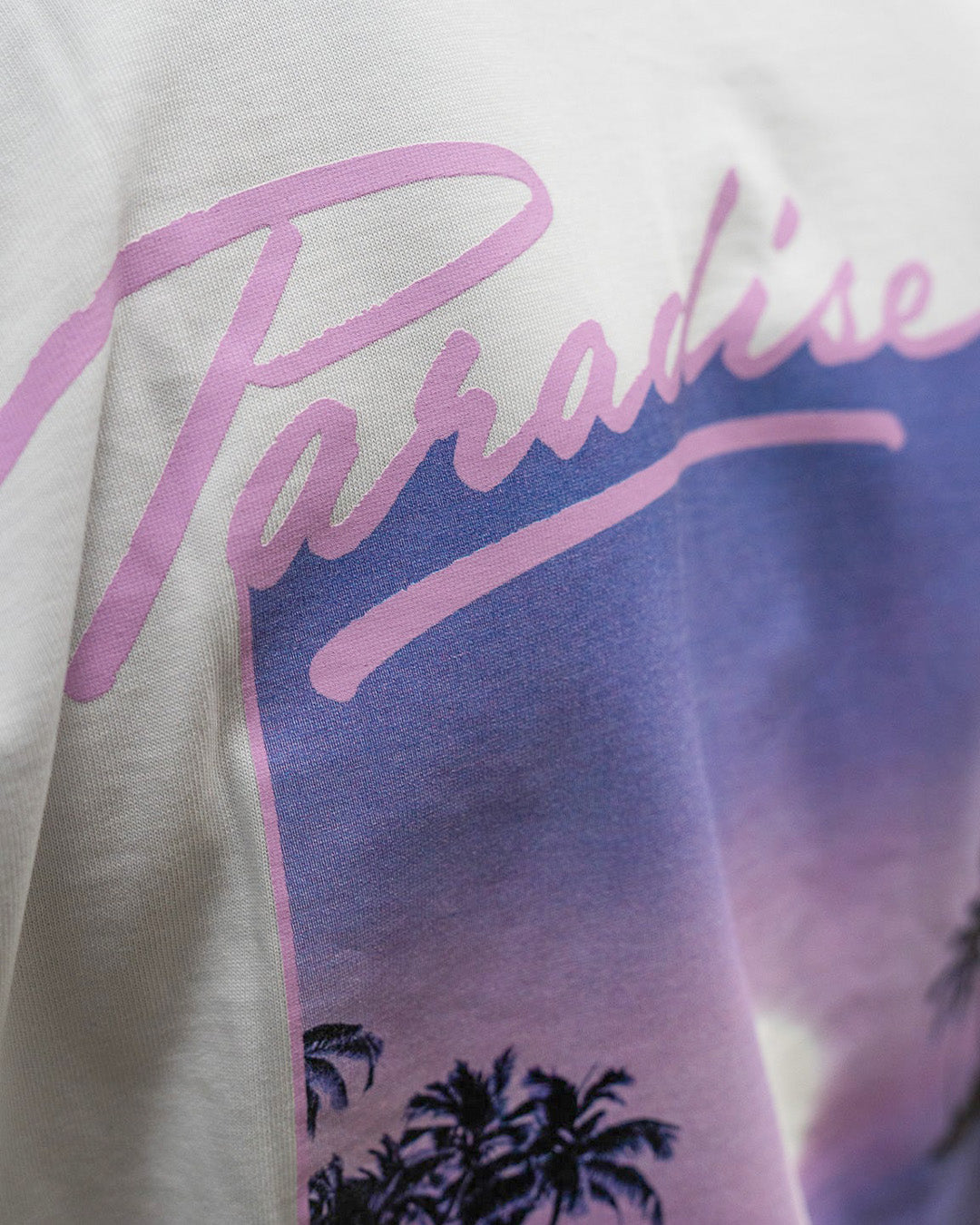 Upgrade your wardrobe with this crisp white T-shirt, featuring a clean Purple Disco Machine logo embroidery on the chest and a high-quality silk-screen “Paradise” artwork print on the back. Designed in a unisex, oversized fit for relaxed comfort and modern style. Made from 100% cotton and easy to care for — machine wash up to 30°C, wash and iron inside out to protect the artwork. Please remember to check the size chart and graphic to find your perfect fit.